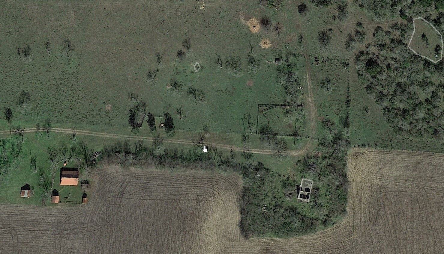 Barns, Log Cabin, Water Wells, Cistern, Riding Arena, watering troughs, hay feeders, plowed and barren field, wooded lane, four pine trees, cattle pens, stored lumber, stored limestone, two tractors, water box, squeeze chute, power line, mustang grape arbor.