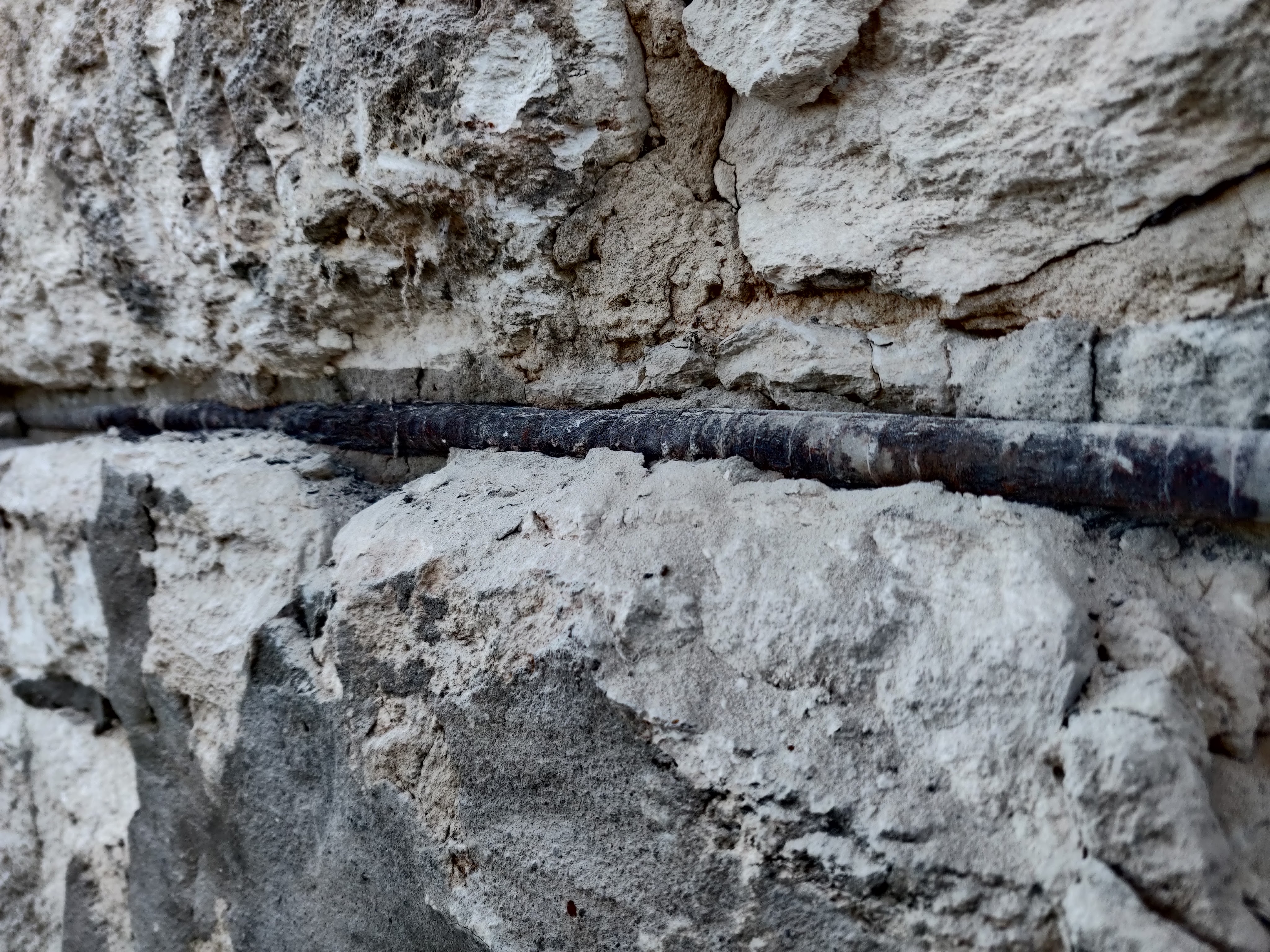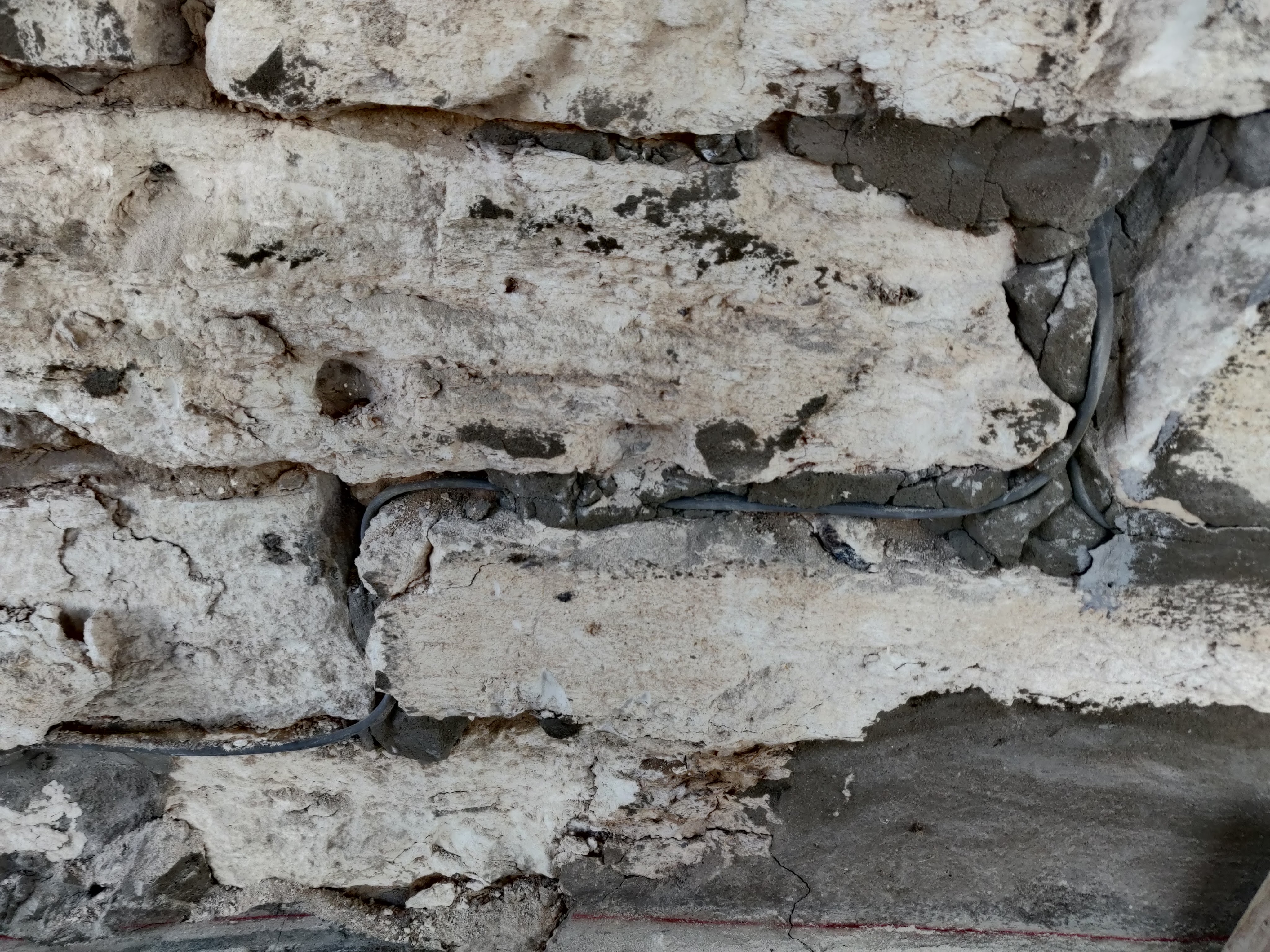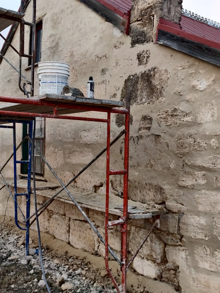 Replacing the mortar in between the stones is a process called repointing. First all of the exterior hardware is removed, electrical wiring, gate attachment points, rods, well intenioned steel plates, pipes, re-bar and more. Then all of the mortar is removed from one side of the wall between the stones-halfway through-whether it is Portland or the original lime putty mortar.