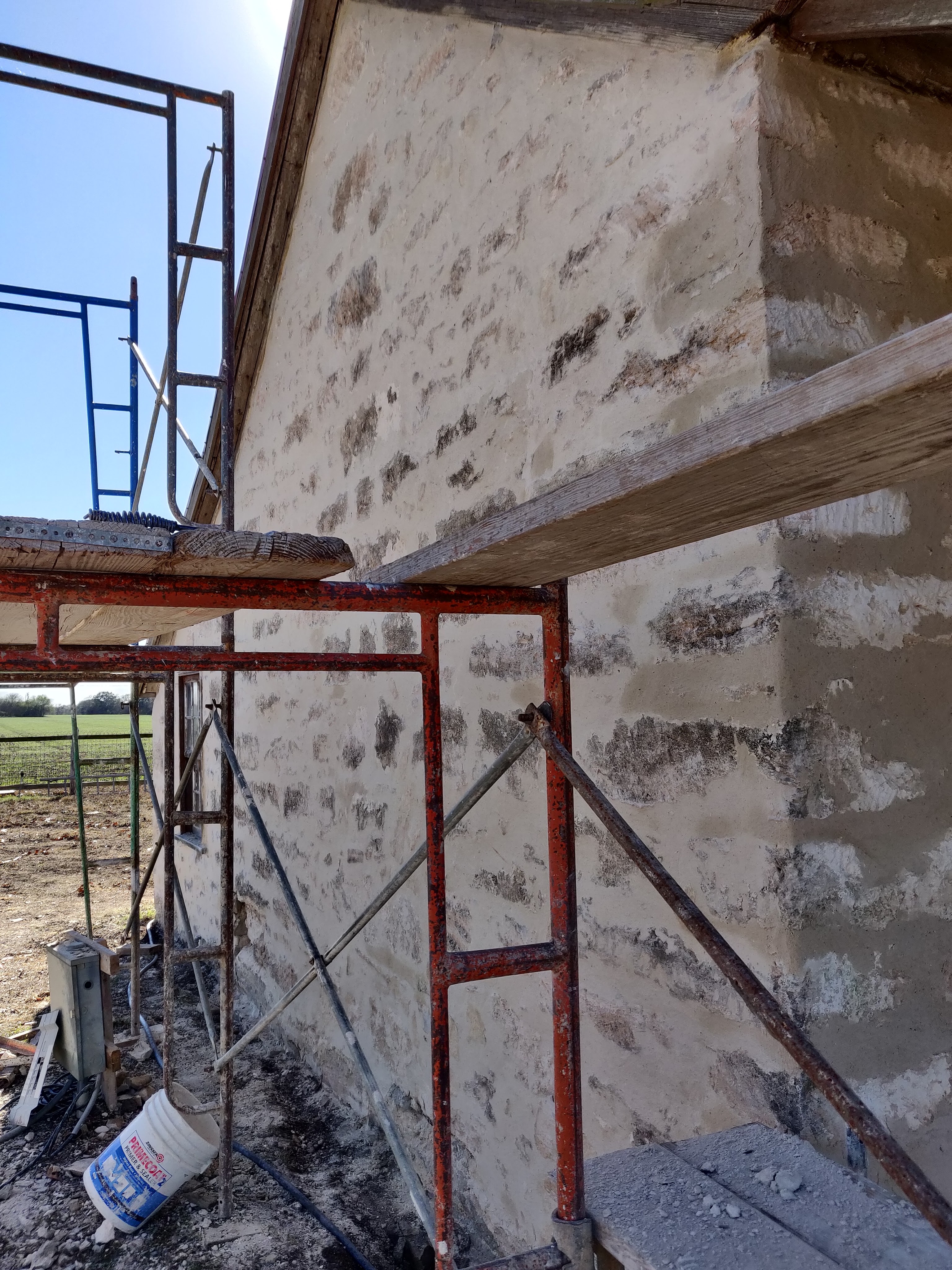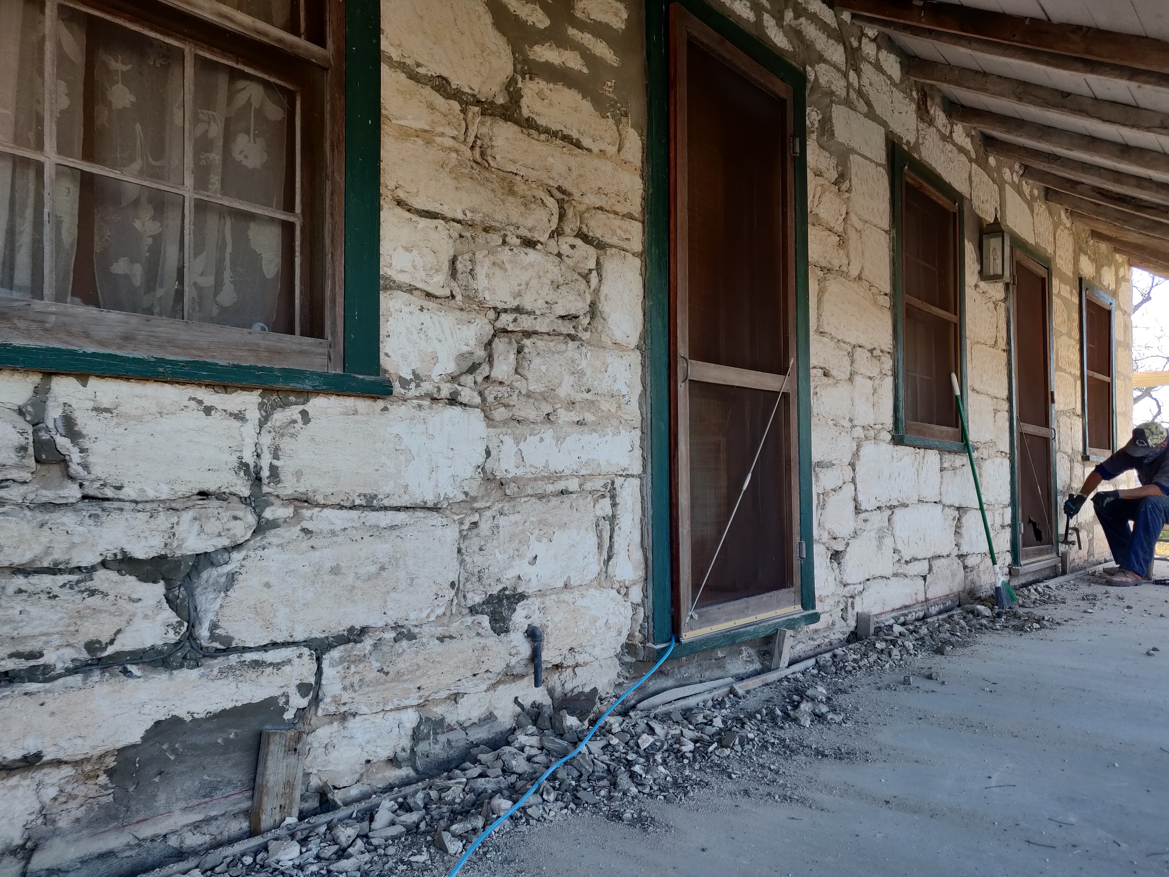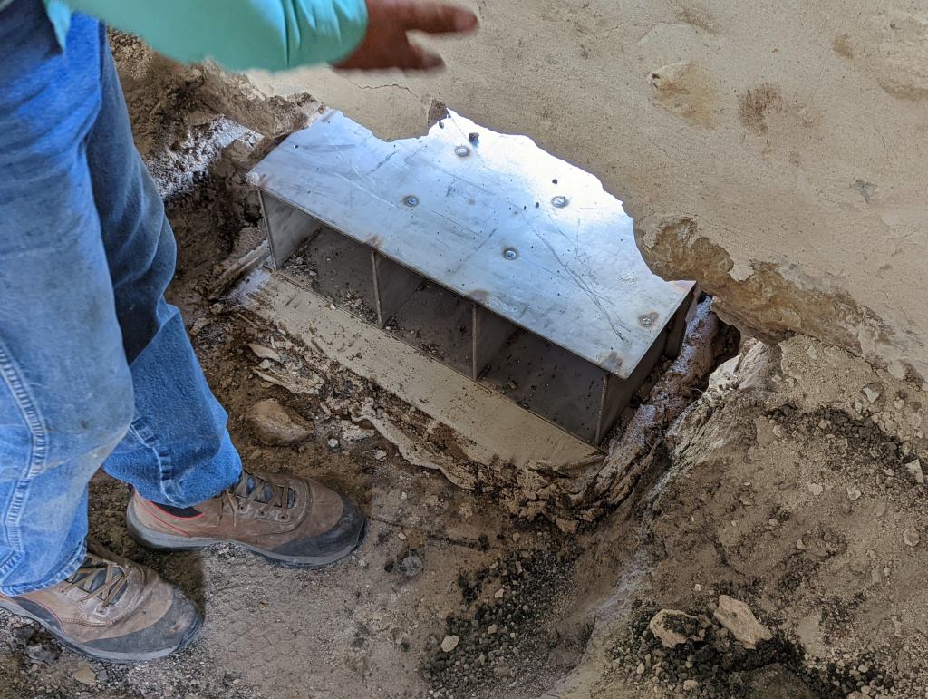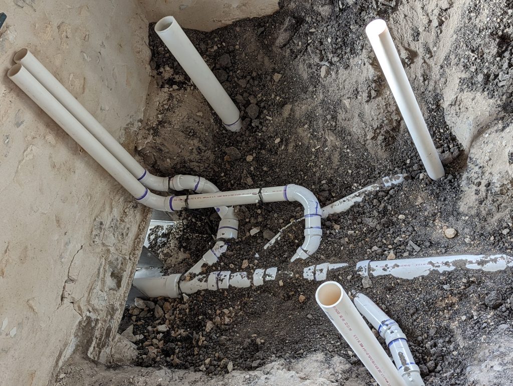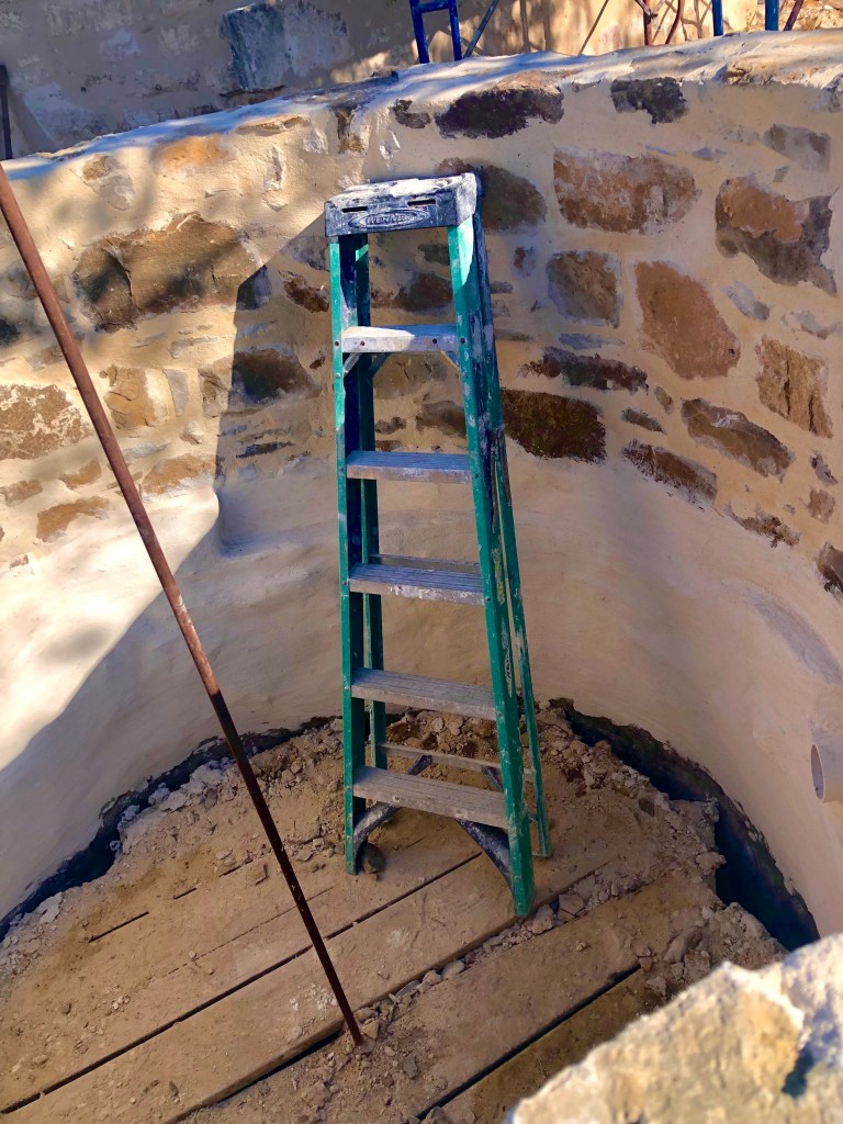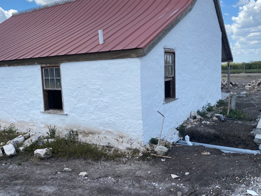 It was going to happen. As we restored and refurbished, certainly more issues were going to arise. And this is one of those first tests. The stonemason, the architect, and several others all gathered around to give the news. After a while, you can start to read the situation before the conversation starts. The non-normal “Hello”, workers deciding to go dig somewhere else when you arrive, everyone wondering what will happen. The experience of the team really did shine on that hot 104°F Texas day. They were cautiously relaxed, and had several solutions. Veteran problem solvers keep projects moving. There was the drill-holes-in-the-wall solution – no way, the good people at the Conservation Society would never approve. There was the unserviceable, put-all-the-pipes in a ditch and just pour extra cement – no way.