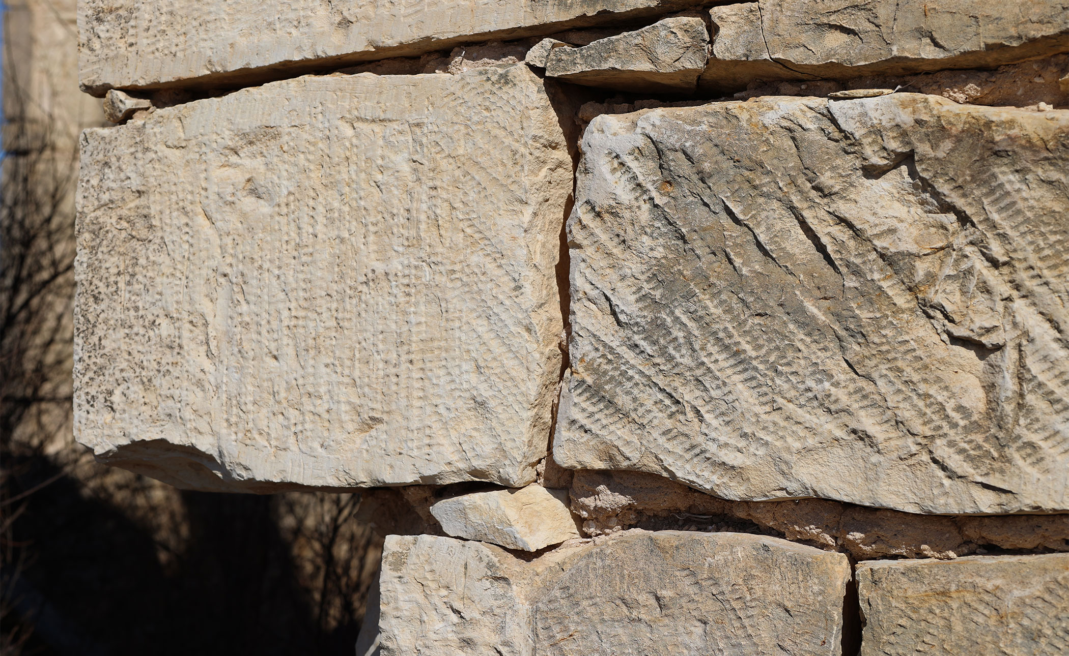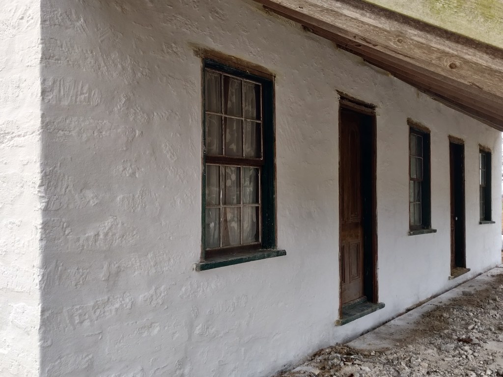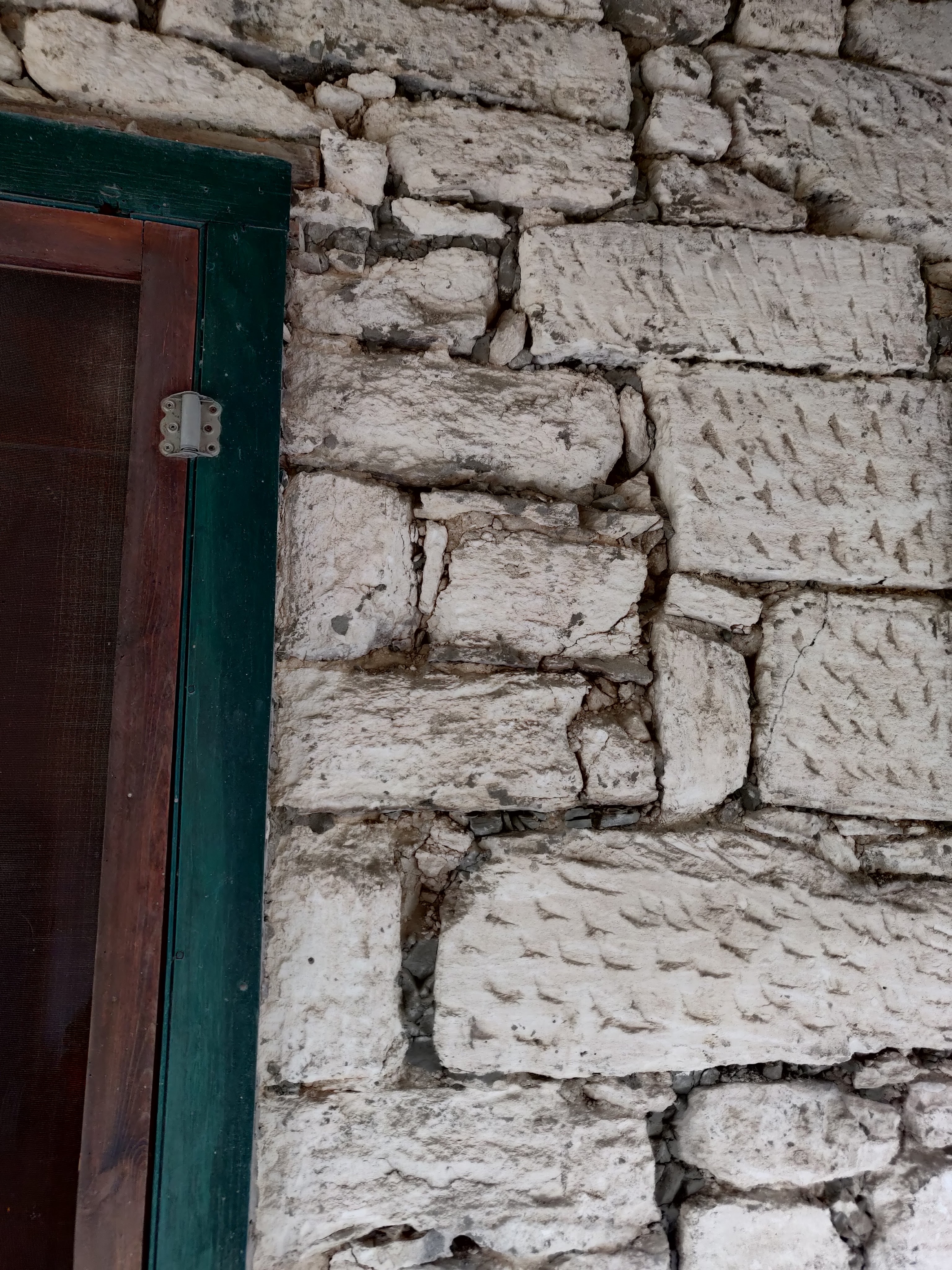 Most of the larger stone blocks at the Rohrbach home have chisel marks on the stone face. This process was done by the original stone mason to increase the purchase or bonding power of the planar wall surface to accept a lime-plaster scratch coat of lime whitewash.