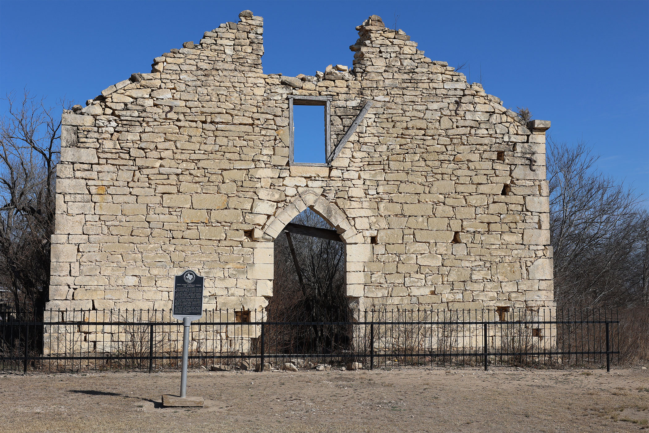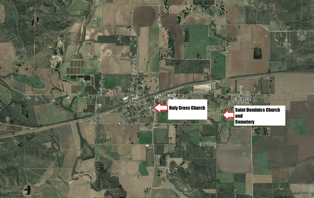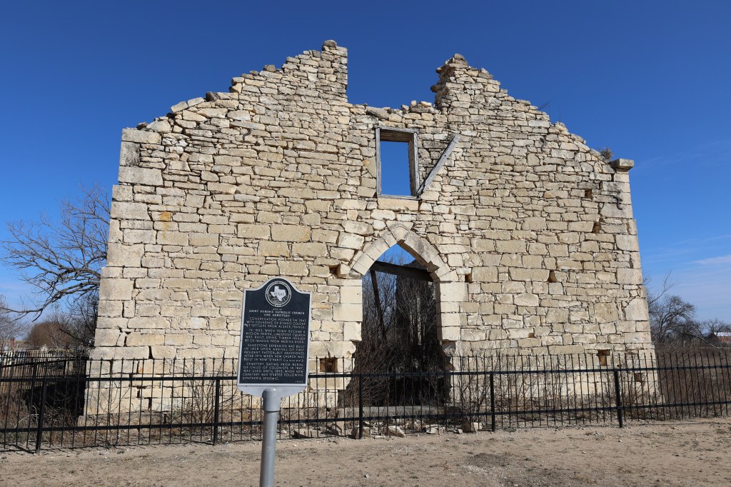 The Texas State Historical Survey Committee recognized Saint Dominic Catholic Church and Cemetery in 1972. The remains/ruins of the church can be seen in D’Hanis Texas 55 miles West of San Antonio just off Highway 90. Located in the Castro Colony of D’Hanis the architecture is representative of the early immigration of Alsatians. The church construction began in 1853 using limestone from a local quarry. Ox-Wagons carried timber from the Medina River, likely at Castroville.